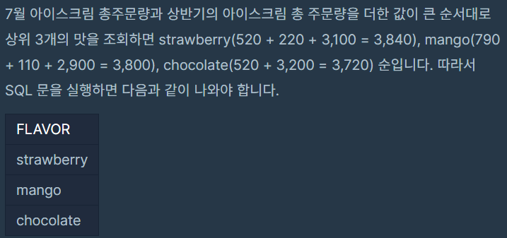 - 이렇게 합쳐진 결과를 기반으로 맛별로 그룹을 지어 총 주문량의 합을 계산하고, 이 합계를 기준으로 내림차순 정렬하여 상위 3개의 맛을 선택