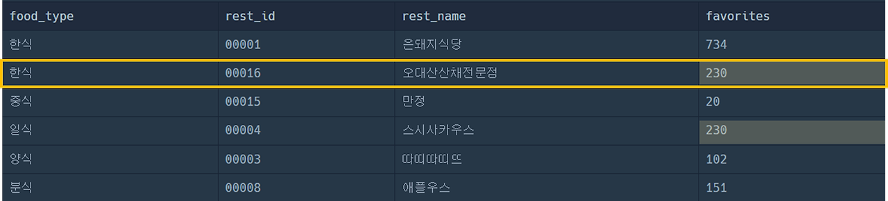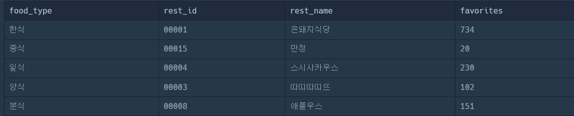 - 외부쿼리에서 이 순위로 필터링하면, 각 음식 종류별로 가장 즐겨찾기 수가 많은 식당만을 선택할 수 있음