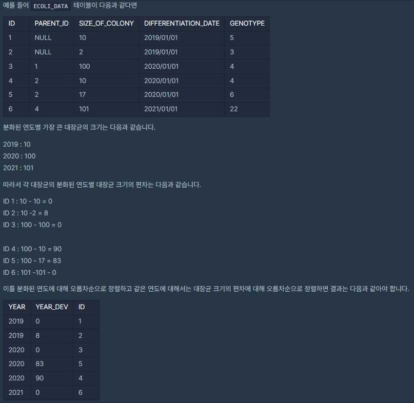 🌟🌟🌟 2. SUM, MAX, MIN - [연도별 대장균 크기의 편차 구하기] _ LEVEL 2