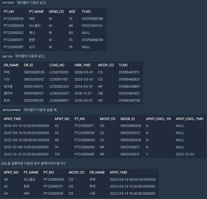 다음은 환자 정보를 담은 PATIENT 테이블과 의사 정보를 담은 DOCTOR 테이블, 그리고 진료 예약목록을 담은 APPOINTMENT에 대한 테이블입니다.