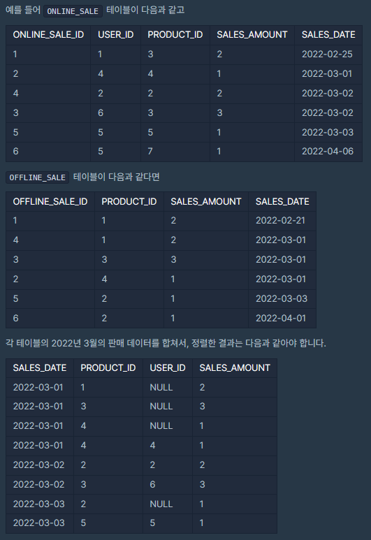 - online_sale 테이블과 offline_sale 테이블을 UNION할 때 전제 조건이 두 테이블의 field 구성이 같아야 한다는 것.