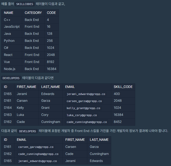 JOIN SKILLCODES S ON (D.SKILL_CODE & S.CODE) = S.CODE # 비트 연산자 &