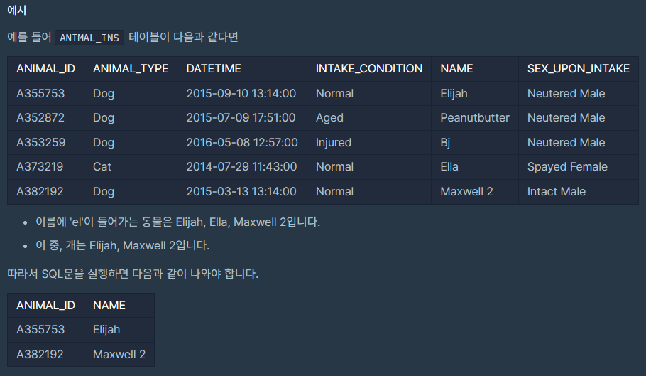 6. String, Date - [이름에 el이 들어가는 동물 찾기] _ LEVEL 2
