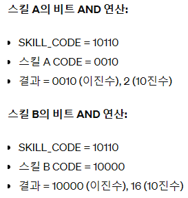 SKILL_CODE 컬럼은 INTEGER 타입이고, 2진수로 표현했을 때 각 bit는 SKILLCODES 테이블의 코드를 의미합니다.