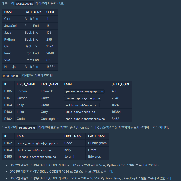 - 여러가지 스킬코드를 가지고 있는 개발자가 있을 수 있기 때문에 DISTINCT 키워드로 중복없이 개발자 인적 정보 출력