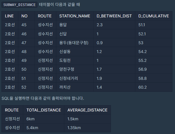 총 누계거리는 테이블 내 존재하는 역들의 역 사이 거리의 총 합을 뜻합니다. 총 누계 거리와 평균 역 사이 거리의 컬럼명은 각각 TOTAL_DISTANCE, AVERAGE_DISTANCE로 해주시고, 총 누계거리는 소수 둘째자리에서, 평균 역 사이 거리는 소수 셋째 자리에서 반올림 한 뒤 단위(km)를 함께 출력해주세요.