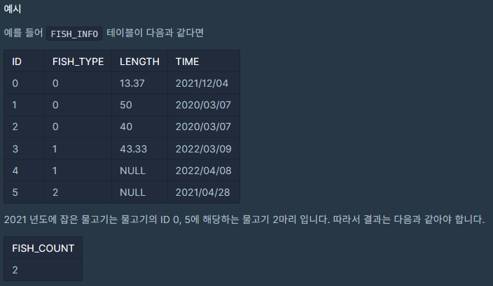6. String, Date - [한 해에 잡은 물고기 수 구하기] _ LEVEL 1