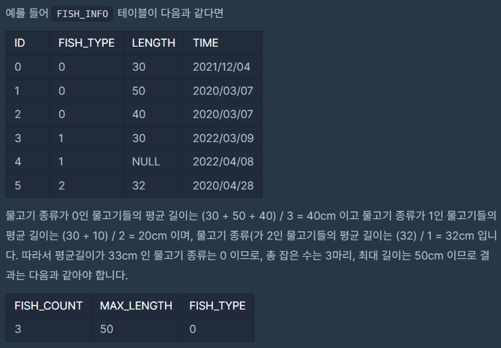 GROUP BY 물고기 종류 HAVING 평균(물고기 길이) - 잡은 물고기의 길이가 10cm 이하일 경우에는