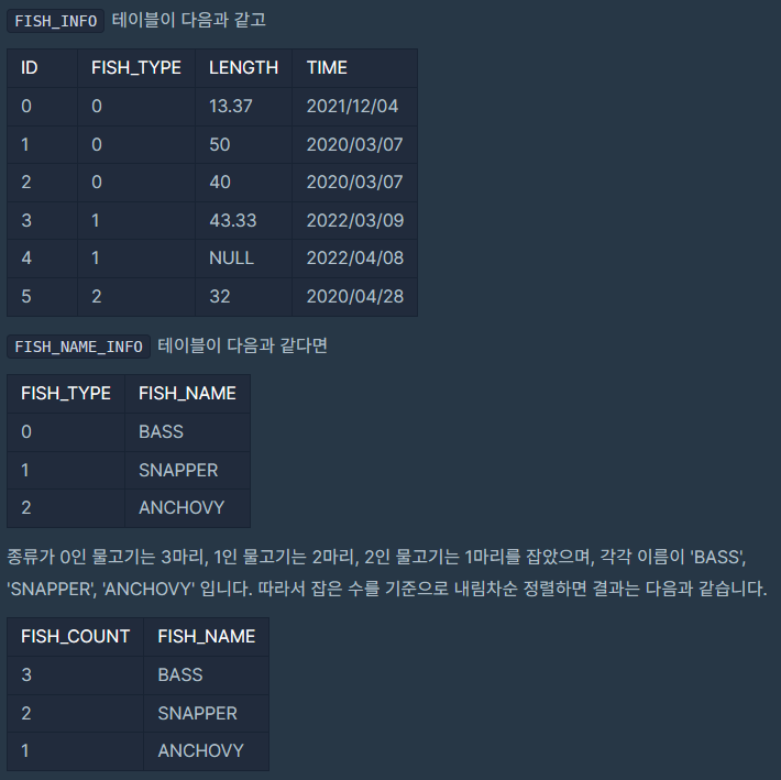 물고기의 이름 컬럼명은 FISH_NAME, 잡은 수 컬럼명은 FISH_COUNT로 해주세요.